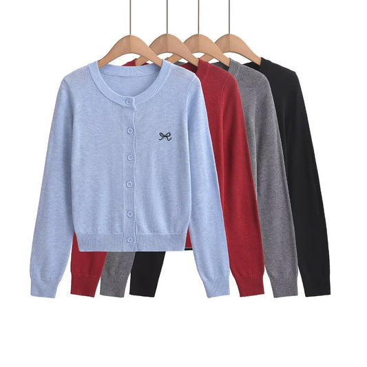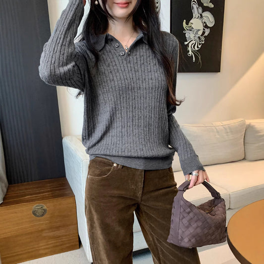 Chic Fitted Buttoned Slim-Fit Knit Top for Women, Short Length, Long Sleeve